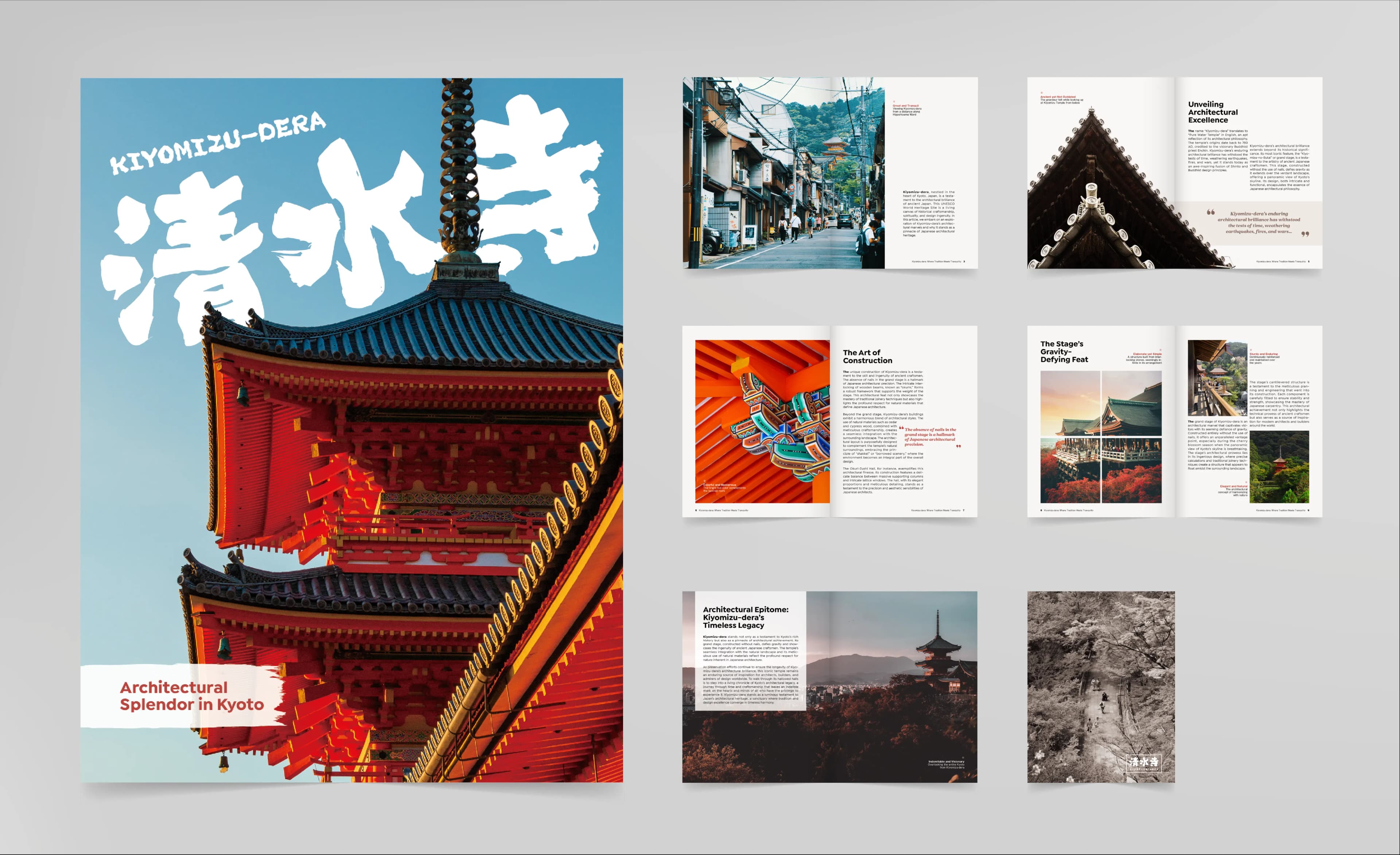 Kiyomizu-dera is a magazine design project promoting the architectural and artistic design of the Japanese temple Kiyomizu-dera in Kyoto. This project has been created in both print and digital formats, with content and layout adjustments made to meet different reader needs.